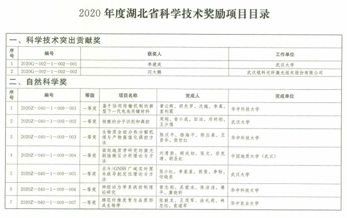 刚刚举行的湖北省科技创新大会上,2020年度湖北省科学技术奖励揭晓,共授奖327项,其中科学技术突出贡献奖2项,自然科学奖40项,技术发明奖30项,科学技术进步奖228项,科学技术成果推广奖12项,科技型中小企业创新奖15项。