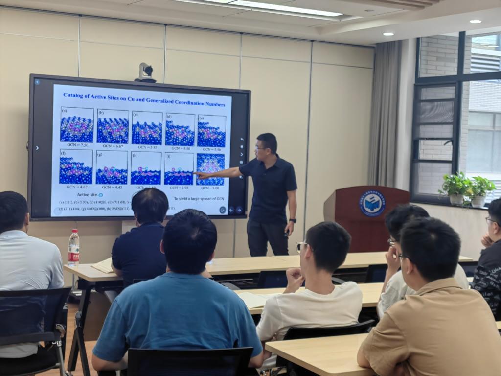 在本次报告中,吕教授介绍了ORRCO2RR等电催化反应中纳米材料的理论计算方法,QM-MM结合的计算模式。这种方法能够有效计算各种复杂纳米结构,如核壳结构、纳米片、纳米线等,其中的应力作用和其电化学过程中反应中间体吸附能力。然后,吕教授分享了一类适用于CO2RR的新的活性描述符——广义配位数,该描述符解释了CuCO2RR的选择性与其表面结构的构效关系,对进一步的实验进行了指导。最后,各位同学和老师与吕老师进行了深入的讨论。