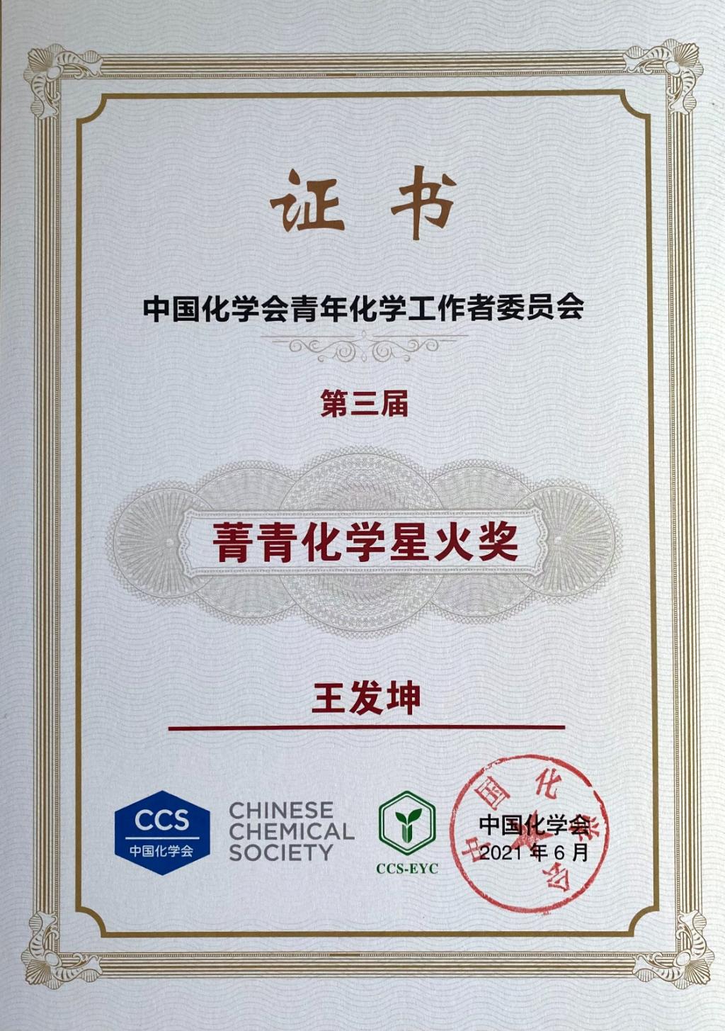 举办,在此期间,举行了第三届“菁青化学奖”颁奖典礼,来自全国的17位在材料与化学相关科研领域中表现突出的青年化学工作者和学生荣获该奖项。我中心的王发坤同学荣获 “菁青化学星火奖”。