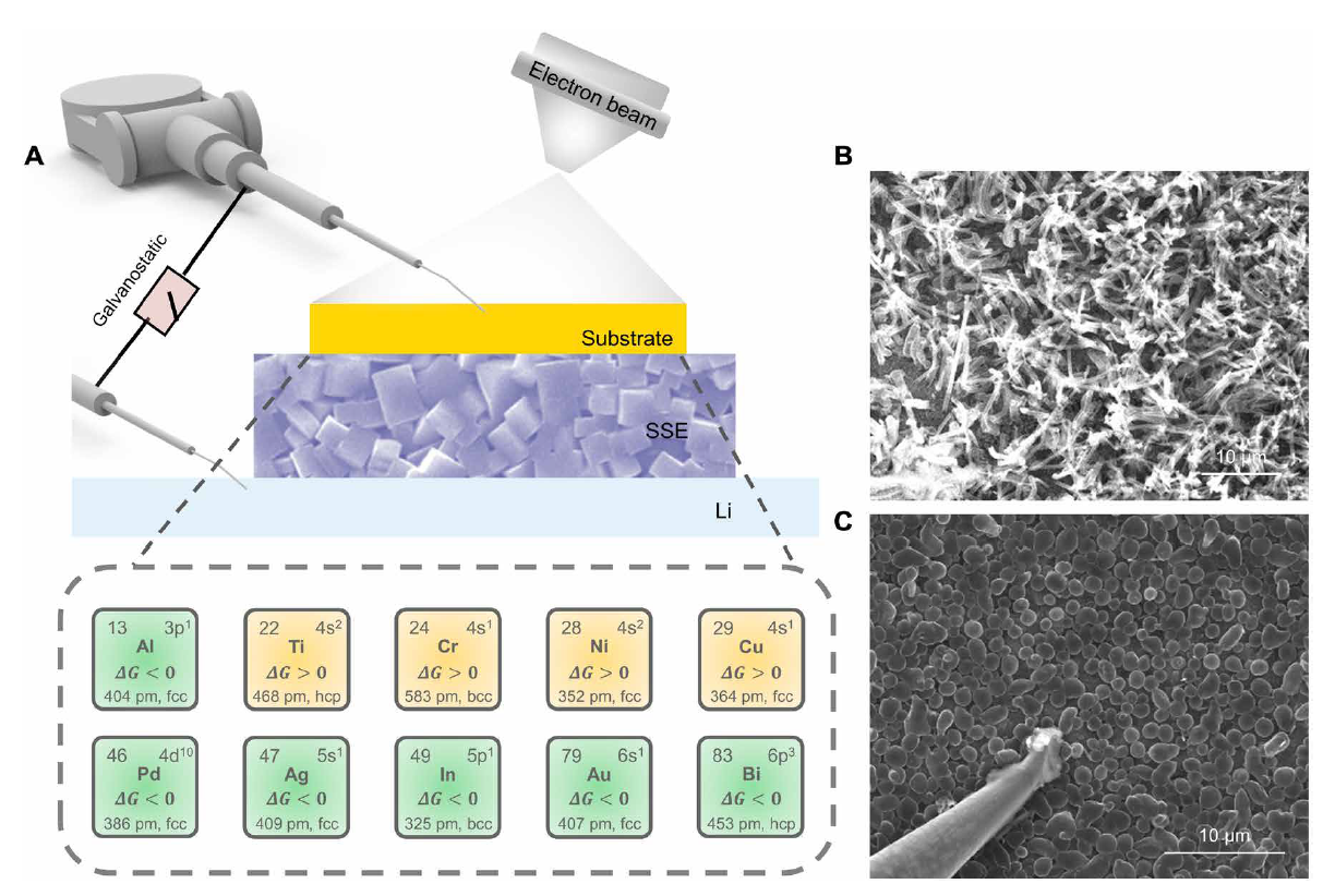 、材料成形与模具技术国家重点实验室李会巧与翟天佑教授团队在固态锂金属电池领域取得了重要进展,其最新研究成果“全固态电池中不同基底上锂沉积行为的可视化原位研究”(Unlocking the in situ Li plating dynamics and evolution mediated by diverse metallic substrates in all solid-state batteries),采用原位电化学SEM表征技术,首次实现了全固态锂金属电池中,Li在十种金属基底上生长行为的原位实时观察;揭示全固态电池中金属Li的沉积行为规律与沉积基底材料间的内在联系;成功追踪到了锂合金化动态过程的直接可视化实验证据,填补Li合金化动态信息的空白;这为未来有效调控锂金属的生长提供了理论依据,实现了锂沉积行为定性到定量的巨大的飞跃,也为Li原子在金属中的扩散提供了新的见解。
