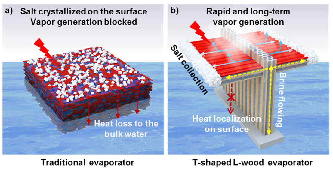 图1. a)太阳能驱动的传统蒸发器示意图。盐在蒸发器表面沉积,导致太阳能吸收率降低。又由于蒸发器直接浮在水面上,热量容易扩散到水体。b)太阳能驱动ZLD的T型蒸发器。C-L-wood与另一块L-wood原木组装成T型结构。盐水从L-wood(“│”)的孔道输送到C-L-wood(“─”)的中线处,然后向光热材料两端输送,在此过程中,水被蒸发,盐在边缘达到饱和析出。该T型装置具有良好的热管理性能,可确保热量限域于材料上表面,从而确保长时间、高速率的淡化过程。