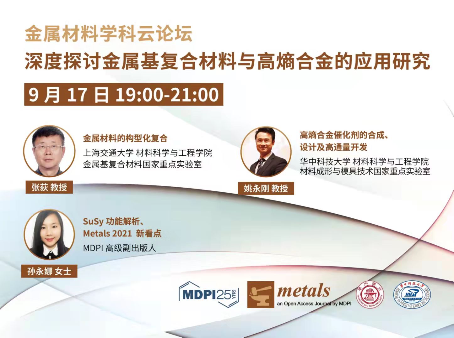 2021年9月17日,新金属材料中心姚永刚老师应邀参加MDPI出版社组织的“金属材料学科云论坛”,深度探讨金属基复合材料与高熵合金的应用研究,此次论坛在寇享、科研云等多个平台进行直播。A漫