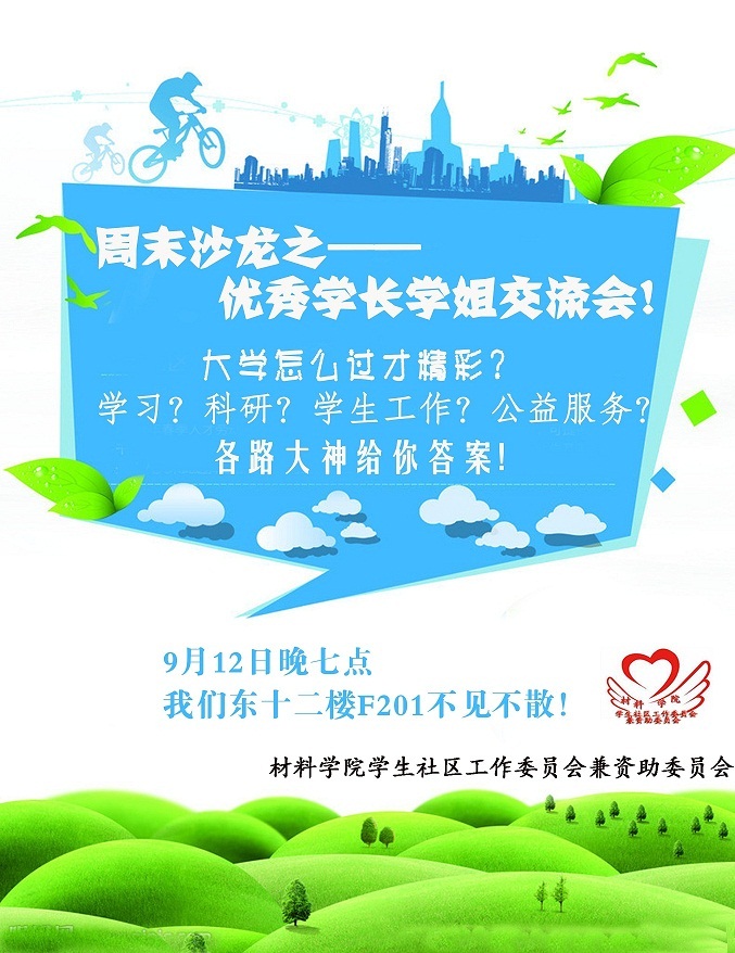社委会将要举办,周末沙龙之“我的大学全攻略--优秀学长学姐经验交流会”。在学习、学生工作、科研和公益服务等方面十分优秀的学长学姐,将上台演讲,向他们传授自己的经验和心得,希望这可以对大一新生有所帮助。
