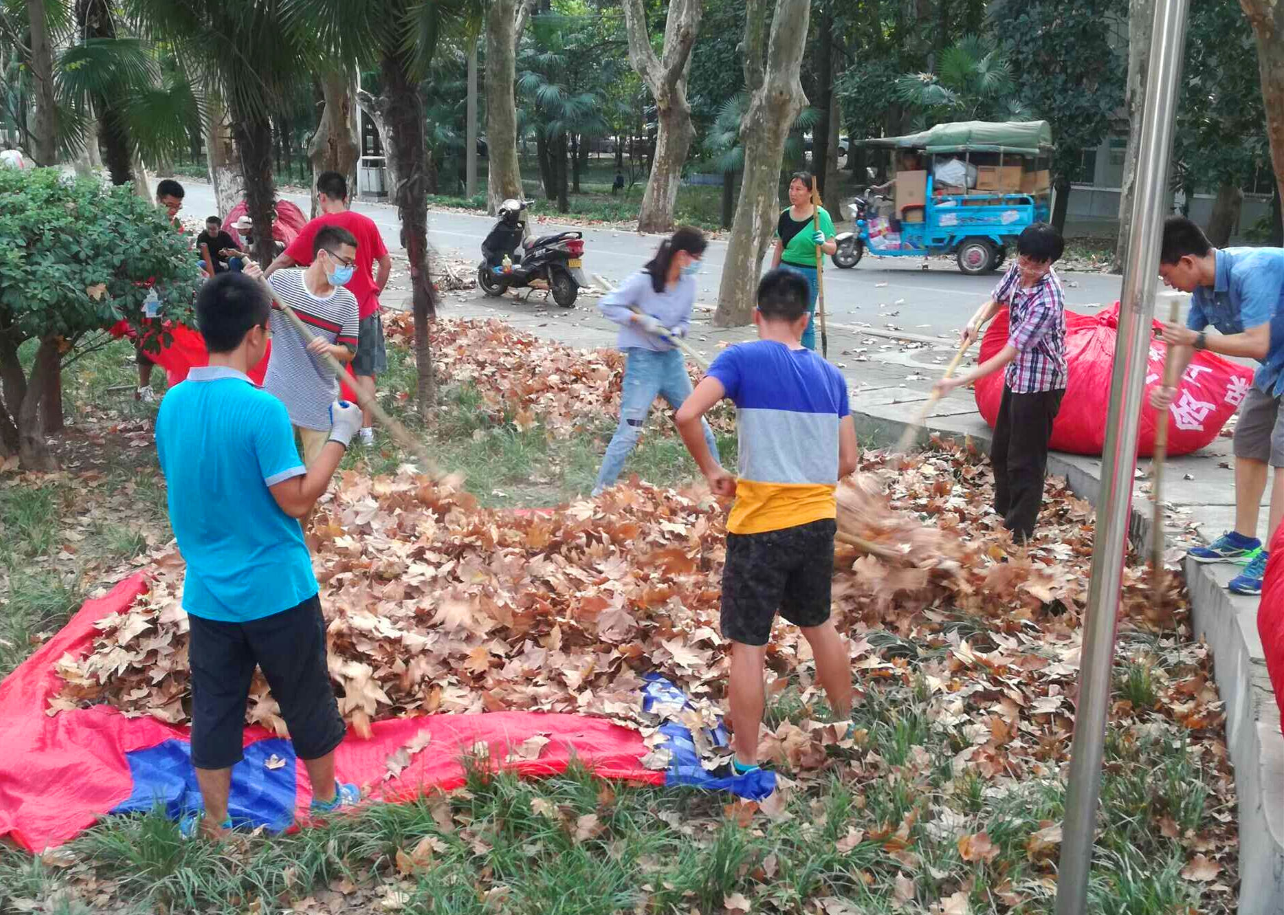 秋风萧瑟,落叶满地,但同学们以饱满的热情投入劳动,有的清扫地面,有的将落叶装车推走,干劲十足。