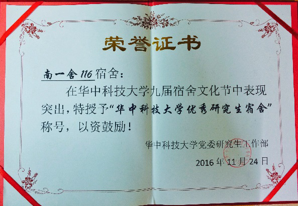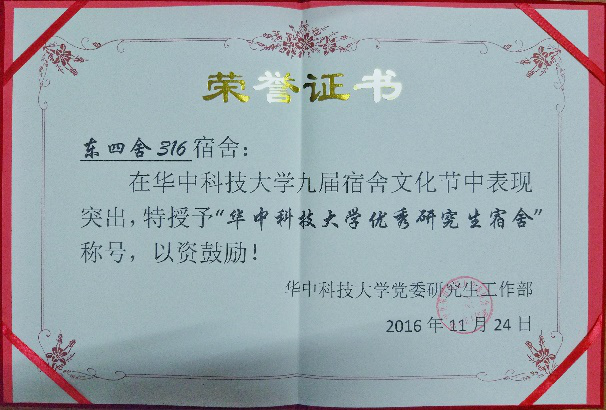 优秀学生宿舍”评选中,我院学生宿舍东四舍316和南一舍116获得优秀宿舍称号。东四舍的四位男生分别为16级材料加工的仇伟、张启宪和16级材料学的胡泉、潘然,他们制定了宿舍水果节和党员特色展等具有宿舍特色的集体活动,同时,宿舍成员在学习和文体活动上的获奖颇多。南一舍116的A漫