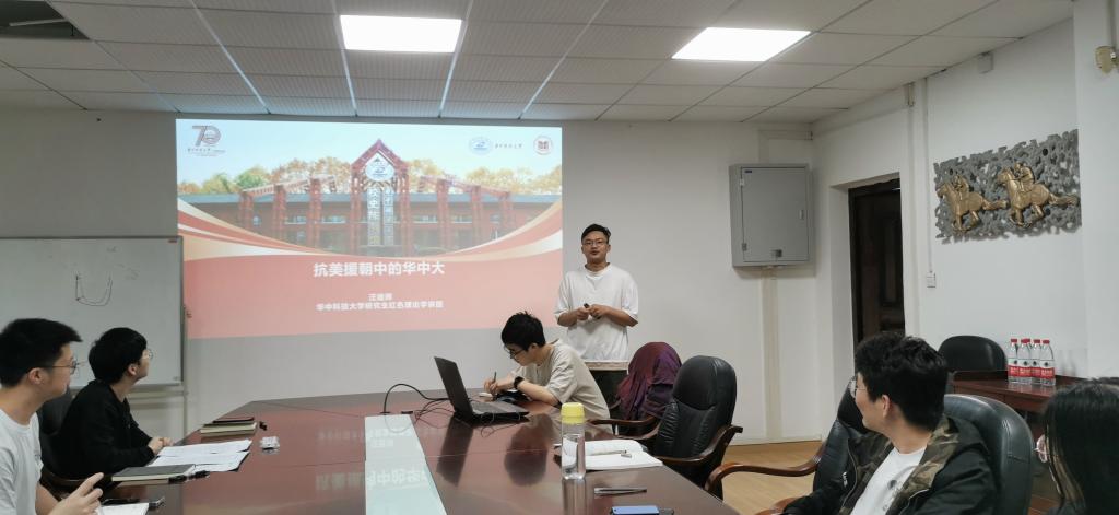 研究生红色理论学讲团讲师汪建辉进行了《抗美援朝中的华中大贡献》主题党课的分享。他首先讲述了抗美援朝战争的起因,“打得一拳开,免得百拳来”,抗美援朝为新中国的发展和壮大奠定了良好的基础。而校史馆中的一卷珍藏的档案,记录了抗美援朝岁月中最可爱的华中大人的烽火岁月。接着他讲述了A漫