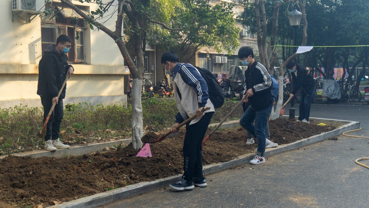 上午8点多,物业服务中心园林指导老师为此次活动提供了树木及铁锹、水桶等工具。9时许,植树活动正式开始,老师和同学们齐聚教一舍面前广场,有序分为十组,每组由一名老师和三名同学组成,负责栽种守护一颗桂花树。