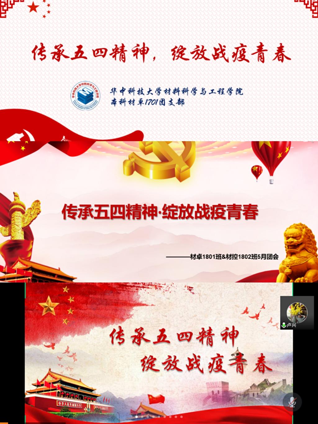 5月25日,副院长樊自田参加了材卓1701班线上主题团会。团会上大家学习了习近平总书记北京大学援鄂医疗队全体90后党员的回信,一名党员就是一面旗帜,90后党员为这个时代增添了一抹鲜艳的颜色;材卓1701班同学集体录制了为武汉加油的三行情诗小视频,为抗疫一线的逆行者加油;学习结束之后,朱李星和禹恒翱同学给大家分享了疫情期间自己参与志愿服务活动的经历。最后,樊自田老师总结到,青年强则国强,不管是00后还是90后,都是“奋斗后”、“努力后”,他建议同学们学好知识本领、充满激情态度、坚定理想信念、勇担时代责任。