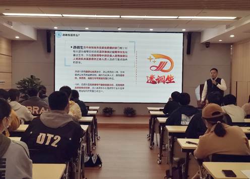 就业专员、研究生工作组长王曦以及40名2023届报考选调的毕业生参加会议。