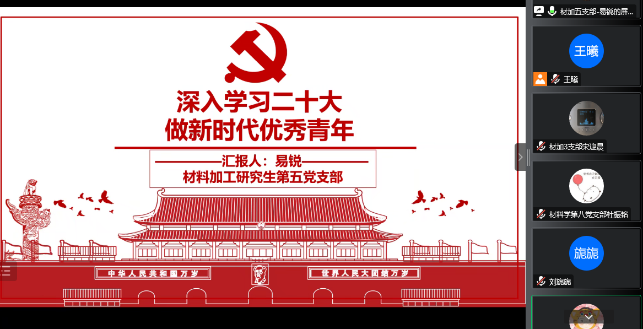 老校长杨叔子先生诗礼传家,丹心热血,拳拳报国,“科学人文总相宜”的教育理念;材料学第十党支部和材料加工第八党支部以新时代下榜样力量生动事例诠释何为“二十大精神”,并倡导大家积极学习;材料学第一党支部以“九个问题”,结合自身讲解关于二十大报告的理解;材料加工第二党支部立足课题组当前科研发展动向,阐述“绿色发展”理念;材料加工第五和第十一党支部号召大家争做新时代优秀青年,既要拒绝“内卷”,更要拒绝“躺平”,见贤思齐,奋发向上。