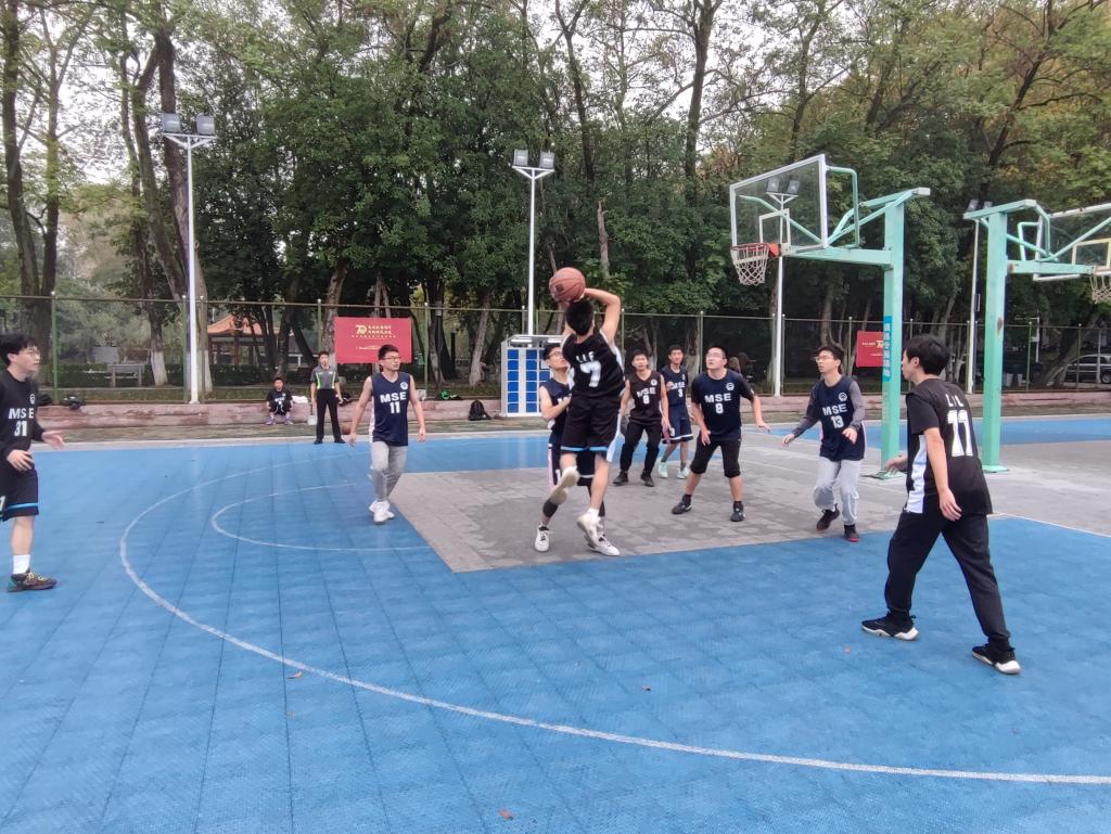研究生会主办,潮州三环(集团)股份有限公司赞助的“潮州三环”杯研究生篮球赛于11月13日中午12:30在中心篮球场开赛,第一天的比赛共有四支队伍参加,分别是材硕2103&材硕2005联队对战材硕2203&材硕2205联队,材硕2106&材博2102联队对战材硕2107&材硕2108联队。