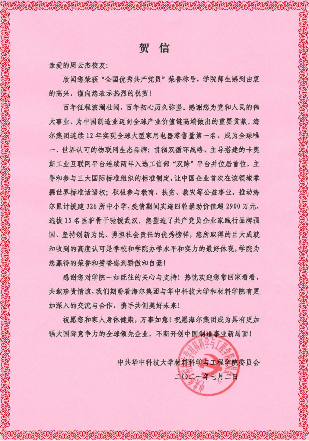 欣闻这一喜讯,A漫 党委代表A漫 师生向周云杰校友表示热烈祝贺,并对他心系母校、对母校事业发展给予的大力支持表示感谢,A漫 为他感到骄傲和自豪。贺信全文如下: