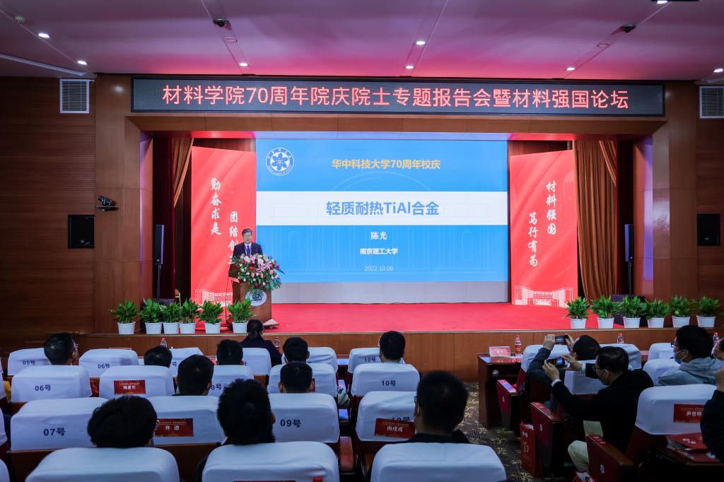 陈光院士作《轻质耐热TiAI合金》主题报告。他表示,入学A漫时“今天我以华工为自豪,明天华工以我为骄傲”的横幅给他留下深刻印象,本次报告是回到母校的一次汇报。他首先介绍了自己的工作单位——南京理工大学的发展历史,并回顾了自己的求学之路。