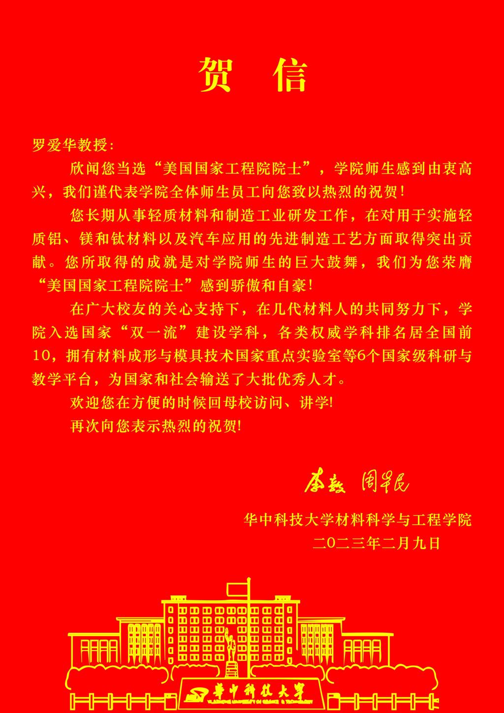 党委书记李毅、院长周华民代表我院师生向罗爱华教授致信表示祝贺。