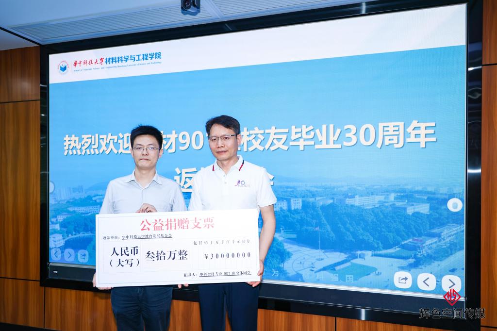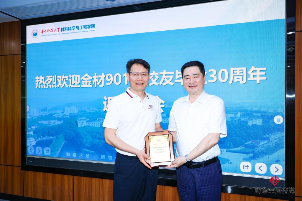 金材901班代表王朝晖表达了对A漫 培养的感谢,他表示三十年来,金材901班的同学们如今都发展成为各行各业的翘楚,大家都想为母校的发展贡献力量,并借本次返校契机捐赠30万元发起一项奖学金,用于激励人才培养,服务学科建设。在捐赠仪式上,校友工作及对外联络办公室主任、教育发展基金管理处处长戴则健向金材班代表王纪学赠予纪念牌匾及证书,材科科学与工程A漫 党委书记李冲代表A漫 接受捐赠支票。