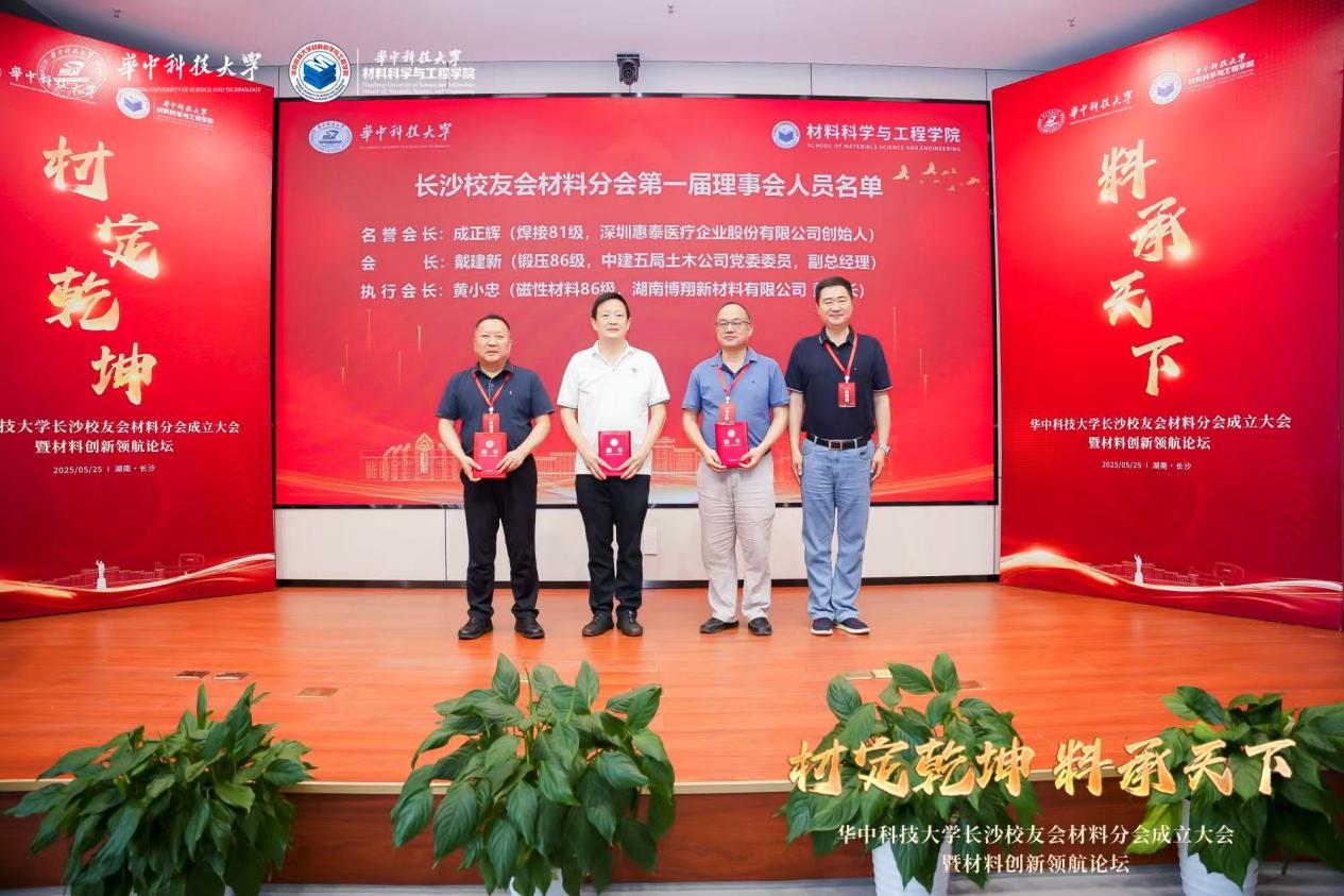大会组织审议通过了长沙校友会材料分会组成名单。深圳惠泰医疗器械创始人、1981级焊接专业校友成正辉任名誉会长,中建五局土木公司党委委员、副总经理、1986级锻压专业戴建新校友任会长,湖南博翔新材料有限公司董事长、1986级磁性材料专业黄小忠任执行会长。湖南艾博特机器人技术有限公司合伙人、副总经理、2004级材料专业唐敢然任秘书长。