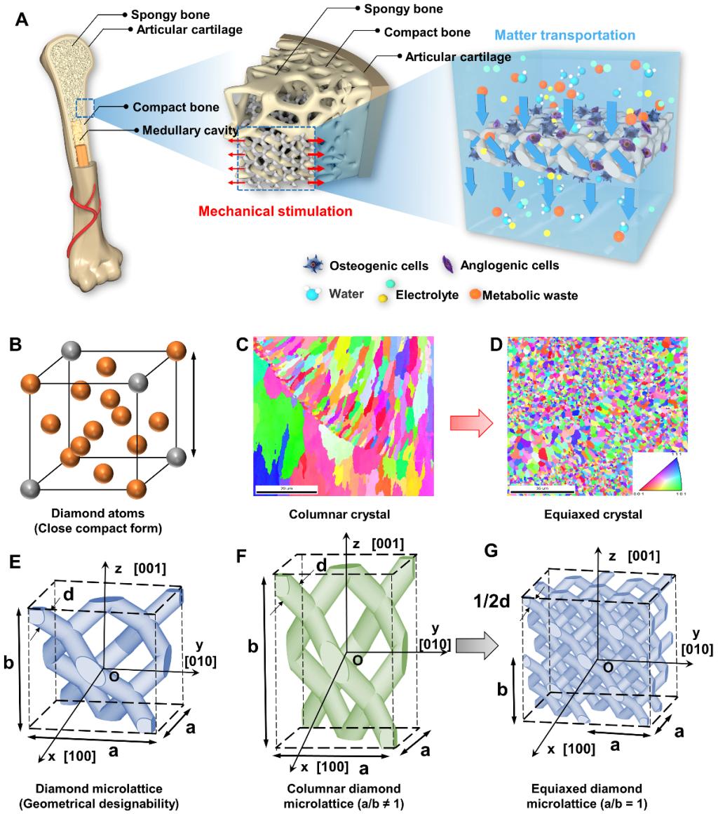 图6 仿晶格超材料生物多孔支架设计示意图。(A)用于修复骨缺损的人工生物医学支架示意图,其中需要同时优化力学和传质性能;(B)紧密形式排列的金刚石原子架构;SLM制造(C)Al-Cu-Mg和(D)Ti/Al-Cu-Mg样品侧面的EBSD(电子背散射衍射)取向图;(E)受金刚石原子启发,具有几何可设计性的金刚石微晶格;(F)柱状金刚石微晶格;(G)等轴金刚石微晶格