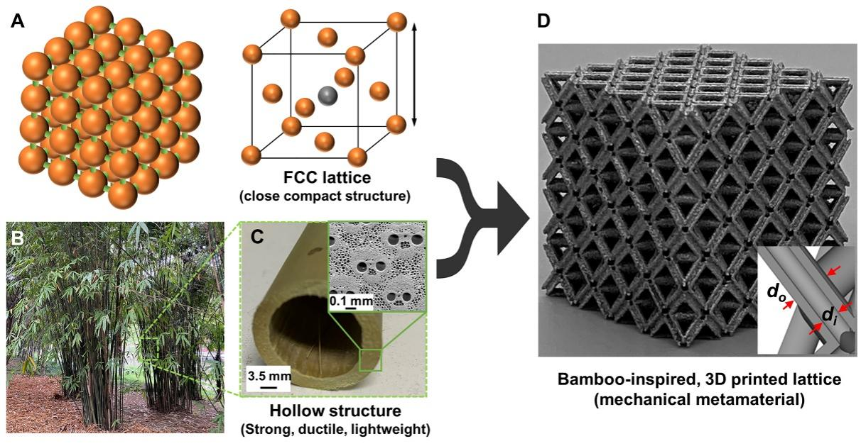 图2 基于晶格的力学超材料灵感来自原子的堆积和竹子的中空特征。(A) 晶格原子的微观形态;(B-C)竹子的宏观和微观形态特征;(D)仿生八重桁架力学超材料
