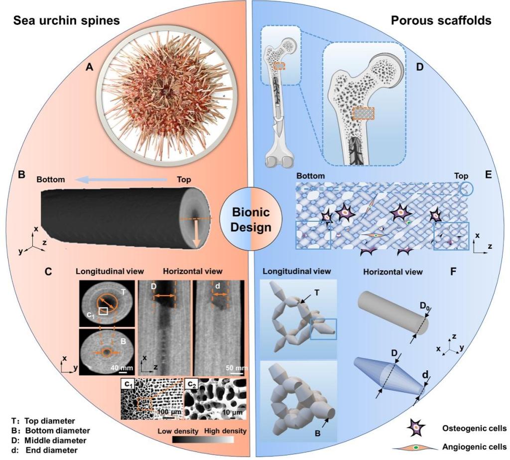 图5 海胆棘及其仿生生物超材料支架的拓扑形态:海胆棘的针状外观和梯度孔隙的内部结构。(A)光学图像显示了海胆脊椎的自然特征;(B)微观计算机断层扫描(CT)图像在水平视图和纵向视图中显示内部分级孔隙度;(C)SEM图像在(c1-c2)剖面图中显示了精细的内部形态;(D)植入物内多孔支架位置示意图;(E)仿生梯度生物五模超材料支架;(F) 与水平视图中的均匀支柱相比,纵向视图和锥形支柱拓扑中梯度密度的几何特征