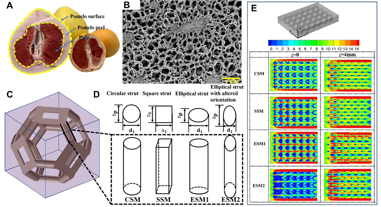 轻质高强兼具散热吸能超材料在航空航天和汽车应用中具有重要意义。团队受柚皮对果肉屏蔽保护的启发,提出了柚皮微结构仿生多面体超材料设计方法,实现了优异的散热和吸能效果。在实验和数值模拟的指导下,具有圆形支柱的超材料在Re=7000–30000时具有最高的努塞尔数、最低的压降和摩擦系数,表现出更高的散热指数;在0.92孔隙率下,热效率系数超过1,表现出较强的隔热能力。此外,具有圆形支柱的仿生多面体结构的比能量吸收超越传统点阵结构,在燃气轮机和冷却结构上有着重要应用前景(Adv. Mater. Technol. 2022, 2200076)。