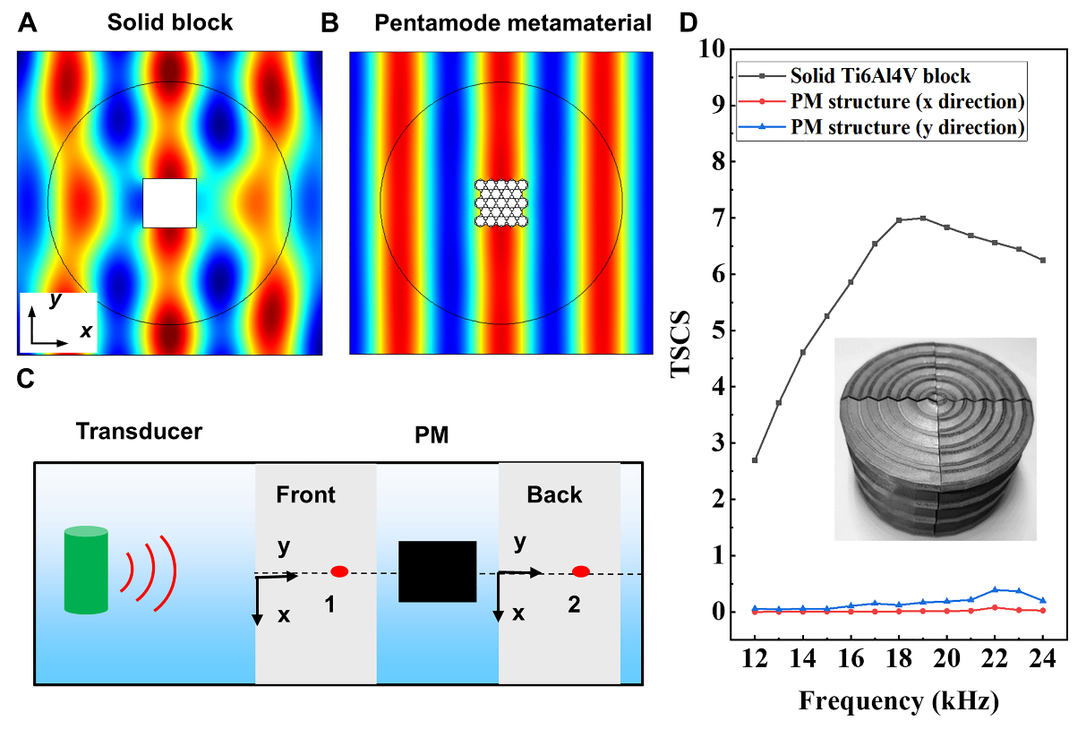 图3 五模超材料类流体声学性能结果。(A)块体钛合金声场云图;(B)五模超材料声场云图;(C)实验装置示意图;(D)总散射界面,定义为各方向散射功率与平面波入射功率的比值