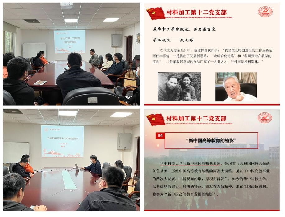 国防材料研究生党支部于4月14日在东八楼开展校史学习。秦建同学分享了朱九思老校长的事迹,阐述了在当时特殊的历史环境下力留人才的故事,朱九思老先生惜才爱才、育德育人,正是因为他的“谋”与“敢”,才让原华中工A漫