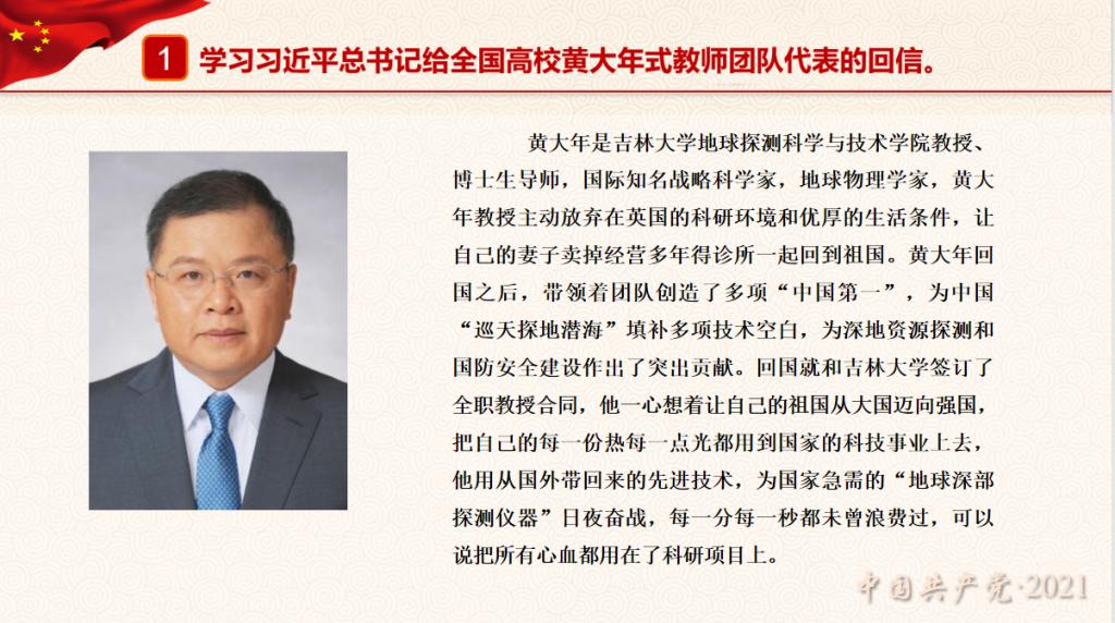 第八党支部认真学习了习近平总书记给全国高校黄大年式教师团队代表的回信,感悟黄大年“心有大我,至诚报国”的精神。