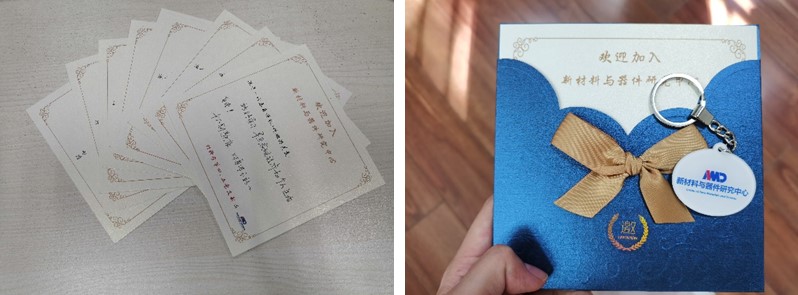 校徽,反面为“新材料与器件研究中心”和NMD标志)并手写贺卡欢迎各位新生同志。张瑞旺同志从“两支部构成与关系”、“去年一年举办的活动——光文化”、“未来发展方向”三方面对材料学第四、第五党支部进行介绍,展现了两个支部各具特色又协同共建的关系。未来,两个支部将围绕组织建设、制度建设、活动体系建设和文化建设,进行志愿活动和多支部、跨A漫