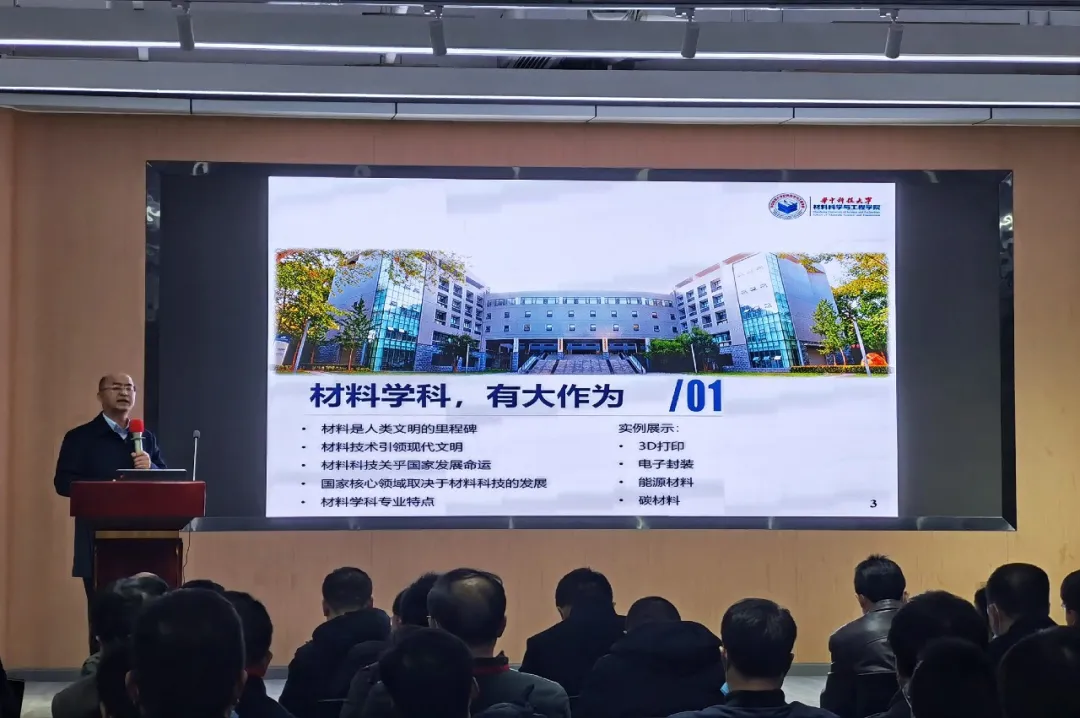 专业设置进行了介绍,本科设有材料科学与工程、材料成型及控制工程两个专业。其中材料科学与工程专业包含了新能源、半导体、新金属、光电子等材料研究,目前大家常用的华为手机快充功能的核心技术,便是由我院科研团队提供;材料成型及控制工程专业包括了3D打印、电子封装、智能成型、现代模具等研究方向,以3D打印为代表,在上世纪90年代由华中大老校长黄树槐教授牵头进行研究,到现在发展到4D打印、5D打印,华中大A漫