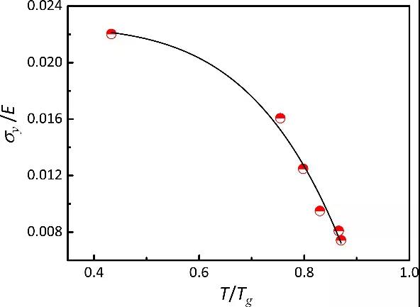 电流作用下金属玻璃强度随温度变化的关系满足:σy ~ (T/Tg)^n, n~5.2。E 为杨氏模量;Tg 是玻璃转变温度。图6表明,电流作用下的软化效应较金属玻璃强度随温度变化的n = 2/3幂律关系更显著,印证了电流作用下金属玻璃的动态回春效应,即:原子运动能力增加。