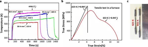 (a) Zr55Cu30Al10Ni5 (Zr55)金属玻璃样品在拉伸实验中的温度变化;(b)常规加热条件下Zr55金属玻璃的拉伸实验;(c) 常规拉伸实验后样品形貌。