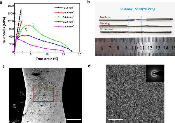 (a) Zr55Cu30Al10Ni5 (Zr55)金属玻璃在不同电流密度脉冲电流作用下的拉伸应力-应变曲线;(b) 变形后样品形貌;(c)金属玻璃颈缩区域形貌;(d) 颈缩区域高分辨电镜照片。