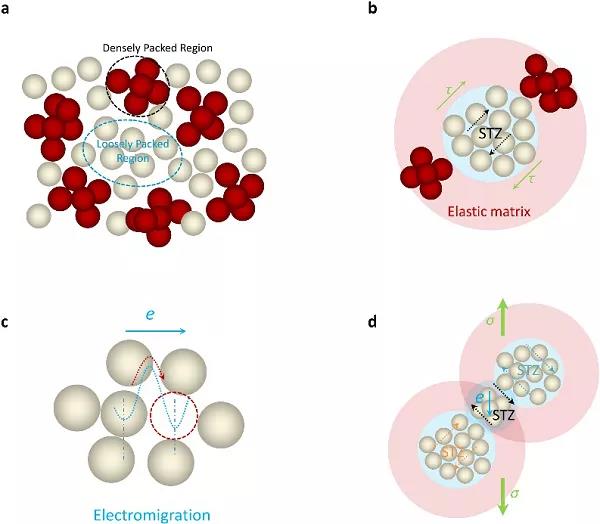 (a) 金属玻璃结构示意图;(b) 剪切转变区示意图(Shear Transformation Zone, STZ):疏松区域为STZ,密堆区域为弹性基体;(c) 电迁移效应示意图;(d) 电迁移驱动金属玻璃发生动态回春。电迁移效应在受到几何约束的原子(Geometrically Frustrated Atoms)上比在自由扩散原子(Free Diffusing Atoms)上更显著,因此优先驱动STZ弹性基体内部的原子扩散,诱导金属玻璃发生动态回春,扩大了STZ区域,促使金属玻璃发生均匀变形,从而抑制了其剪切带形核。