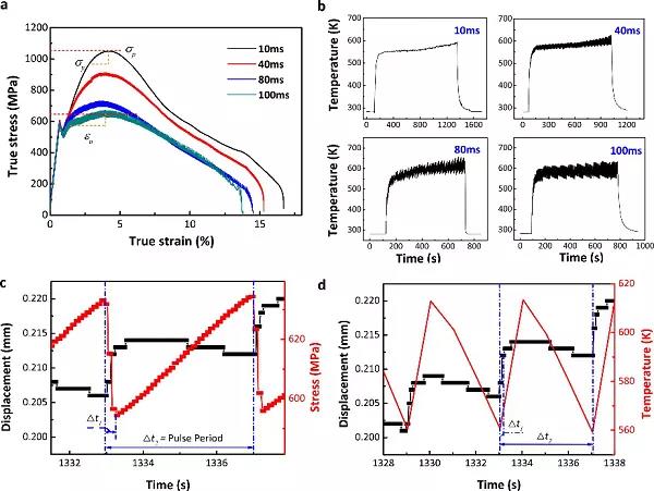 (a) Zr55Cu30Al10Ni5 (Zr55)金属玻璃在不同脉宽脉冲电流作用下的拉伸应力-应变曲线,脉宽/周期=1:40;(b)不同脉宽条件下拉伸实验中样品温度变化;(c)载荷与位移的同步变化;(d) 位移与温度的同步变化,表明位移增加并不是由焦耳热引起的温升导致。