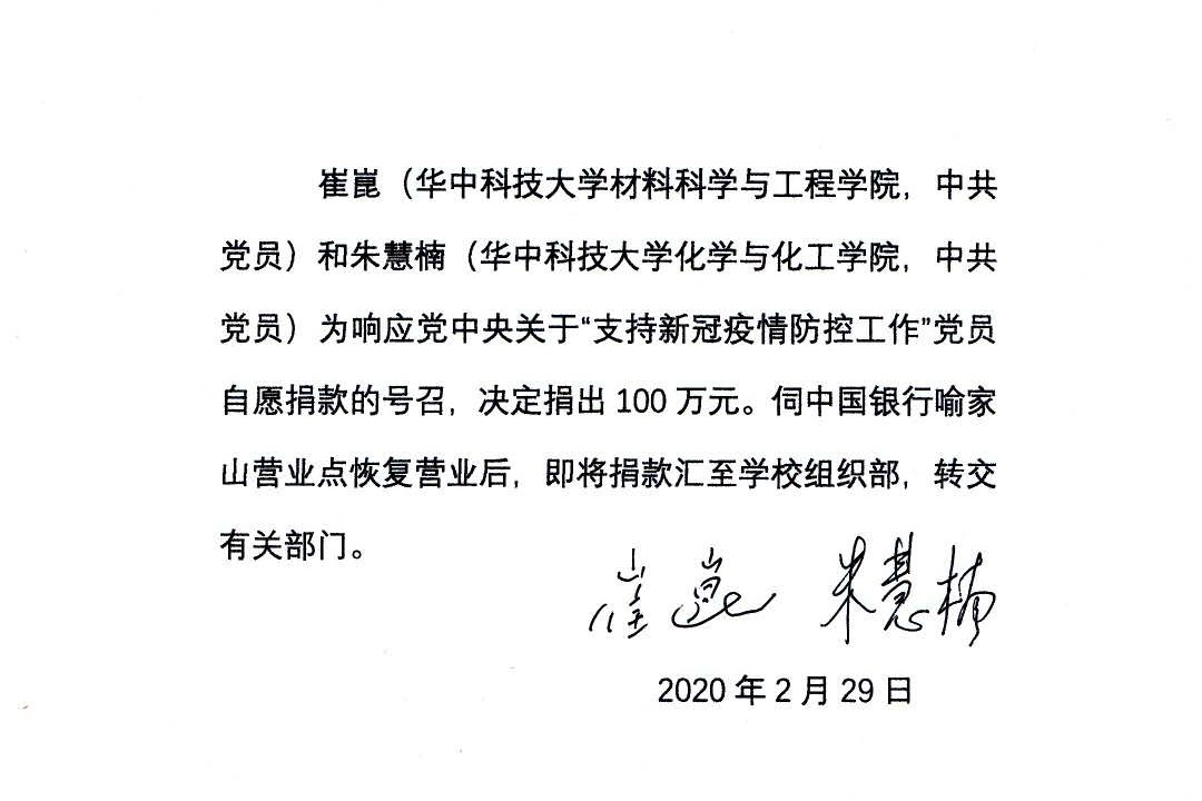 为响应中央关于“支持新冠疫情防控工作”党员自愿捐款号召,崔崑院士与夫人朱慧楠教授第一时间联系A漫