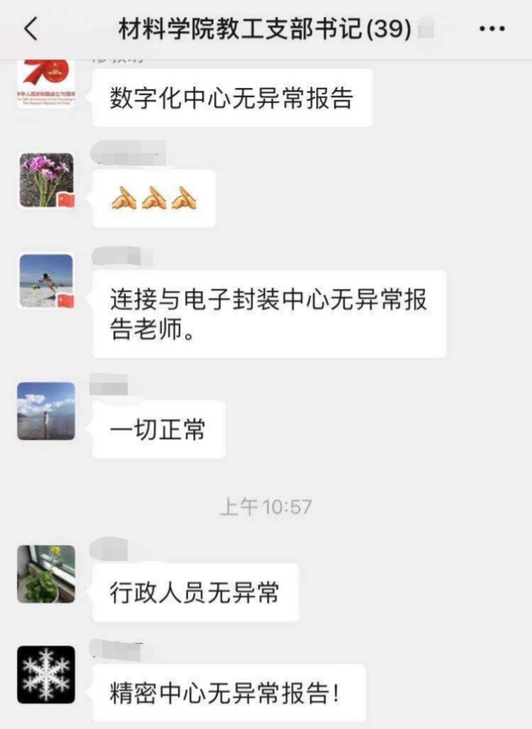 教工支部书记微信群消息不断:“连接与电子封装中心无异常报告”、“退休人员无异常情况”、“快速制造中心一切正常”......