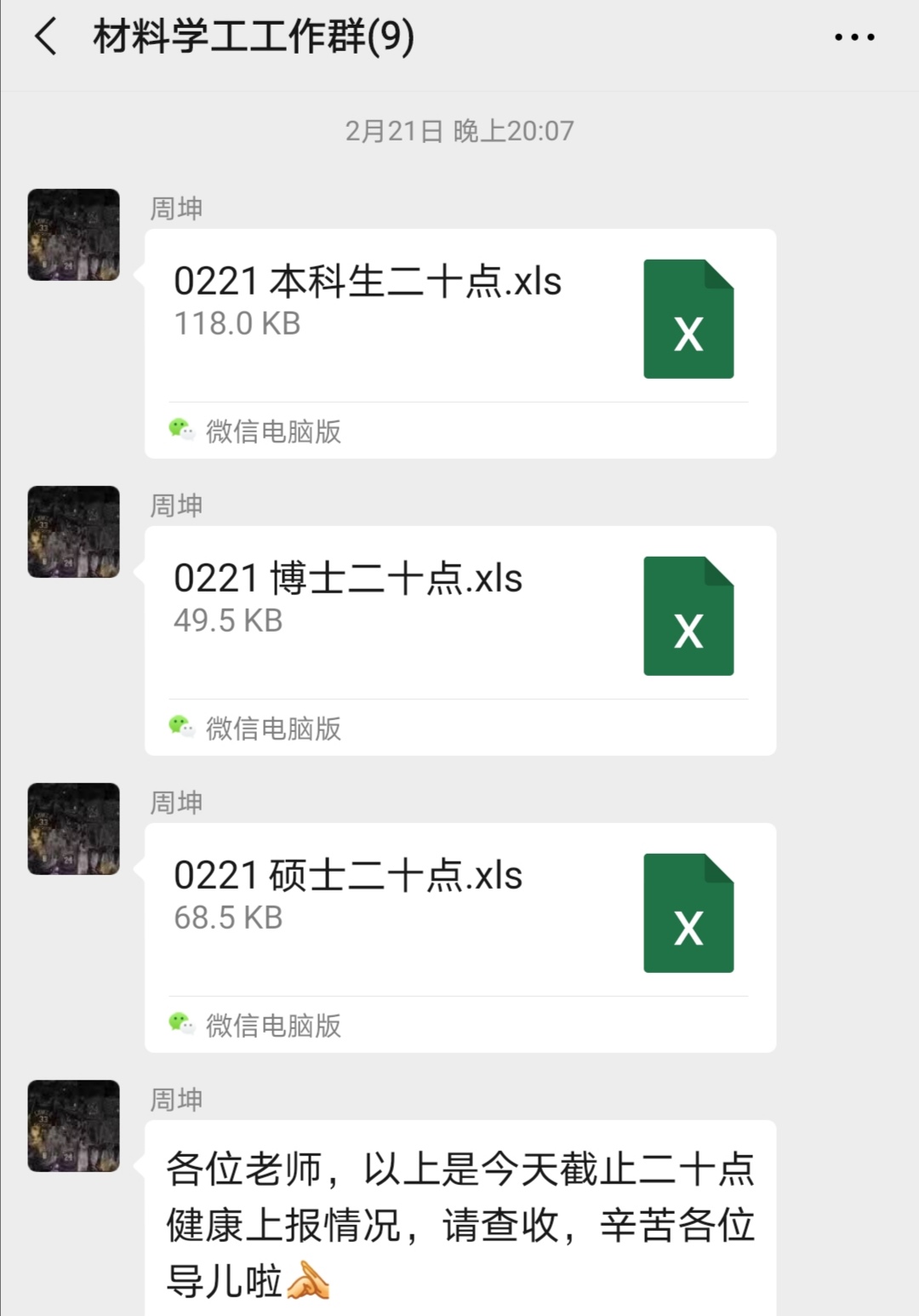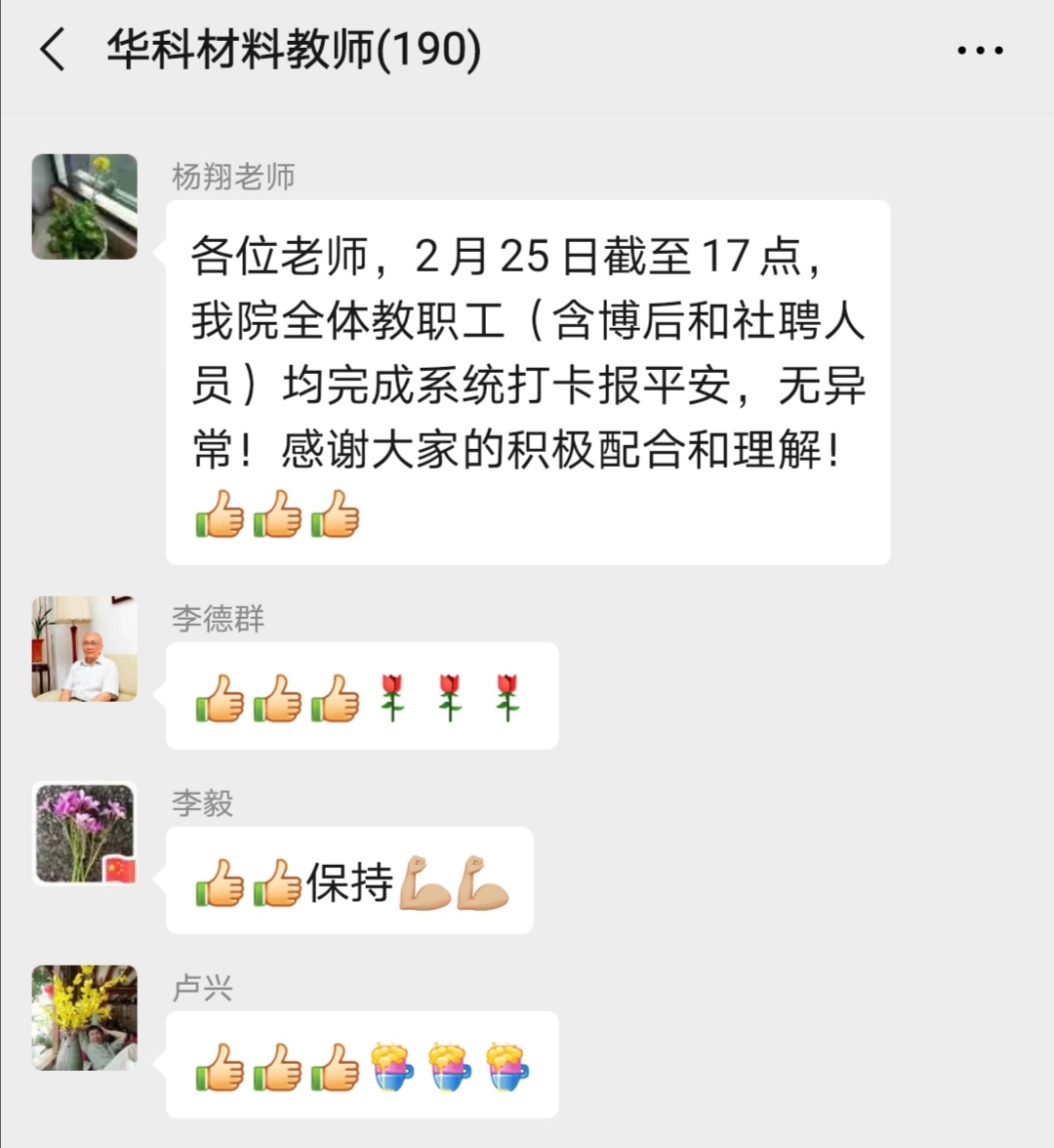 机关党支部微信群响起了温馨提示:“各位老师,新的一天,请大家报平安及在微校园系统填报健康状况,大家开始接龙啦!”这是机关支部书记杨翔开始了每日健康情况信息上报工作。