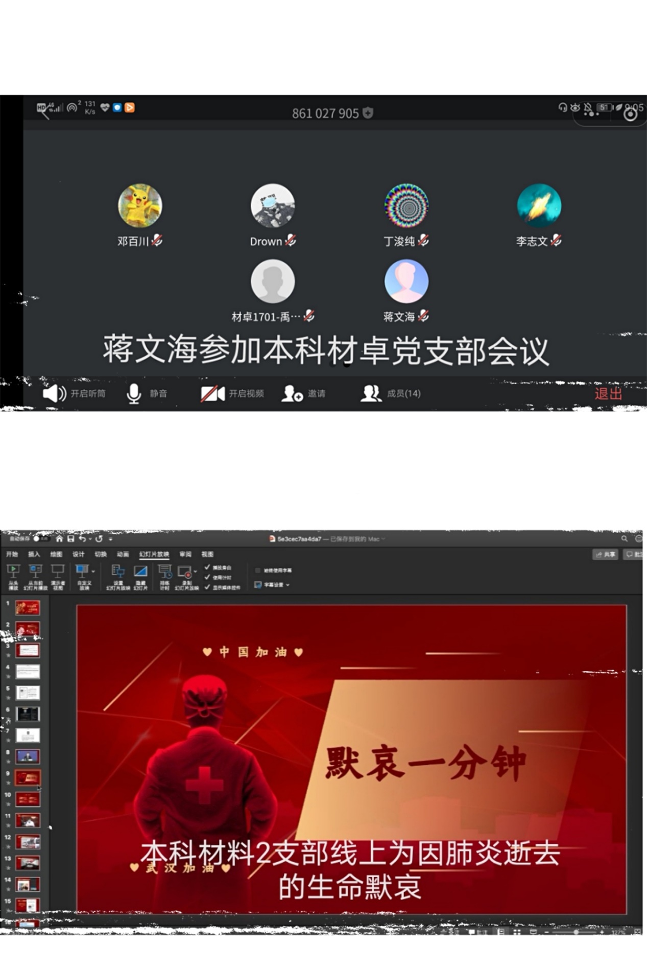 ——晚上8点30分,蒋文海老师准时上线,参与所在本科材卓党支部召开的“坚定信心,众志成城,共克‘疫’艰”专题组织生活会。2月15日至20日,学工组所有辅导员均下沉到学生党支部,参加学生支部组织生活会,了解同学们在疫情期间思想动态,引导同学们在疫情期间更要坚定信心,坚定信仰,勇担时代责任和使命,以一世之学济一世之治。