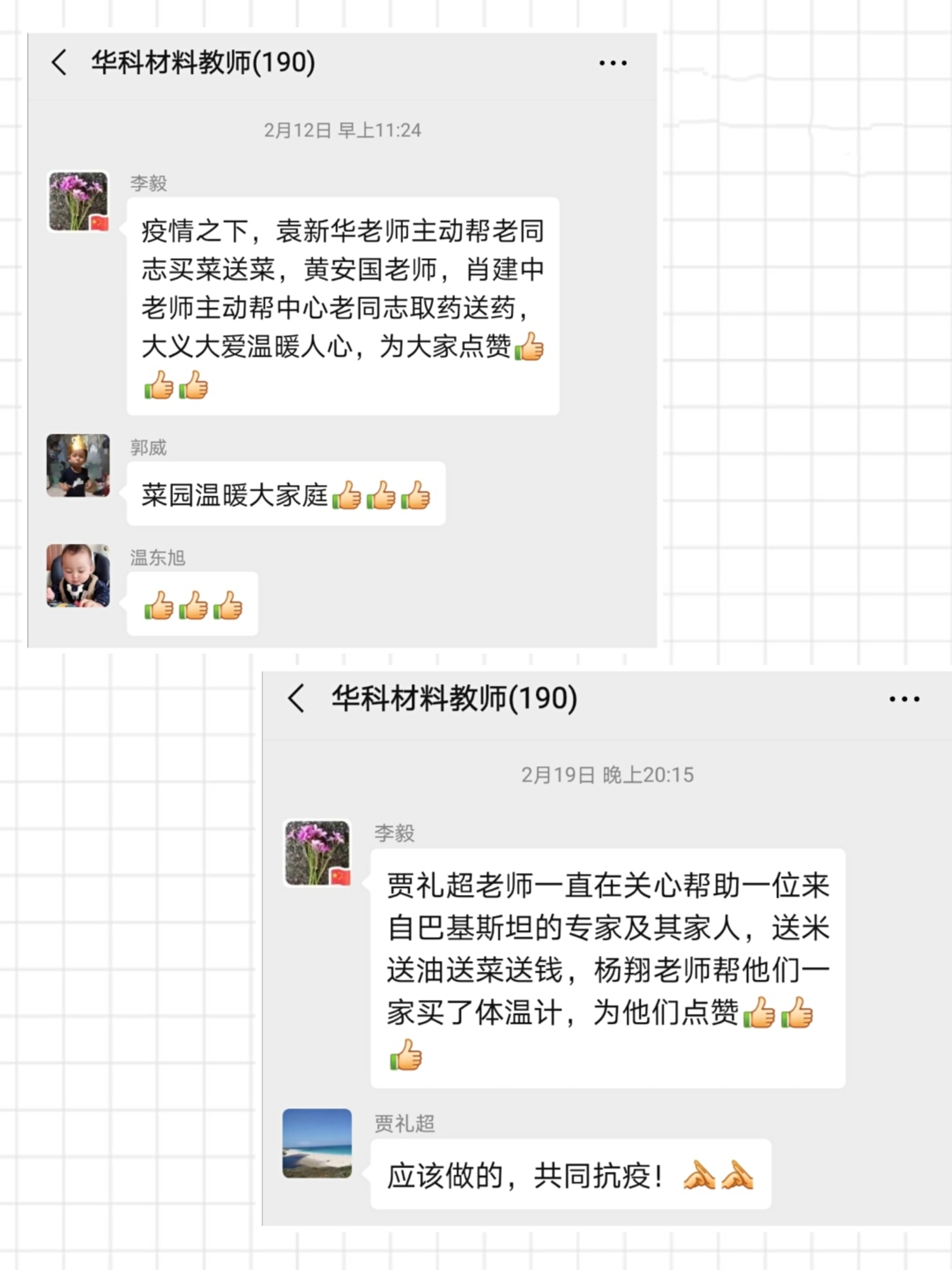 ——上午11点,党员肖建中来到退休老师家门外,将一袋药品放在门口后离开。此时,袁新华也顺利将蔬菜等生活物资送抵崔崑老师家门外。巴基斯坦专家及家人因疫情滞留武汉,在生活必需品缺乏的情况下,贾礼超老师为他们送去了米、油、菜,杨翔为他们购买体温计,协助他们做好健康监测。