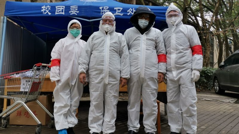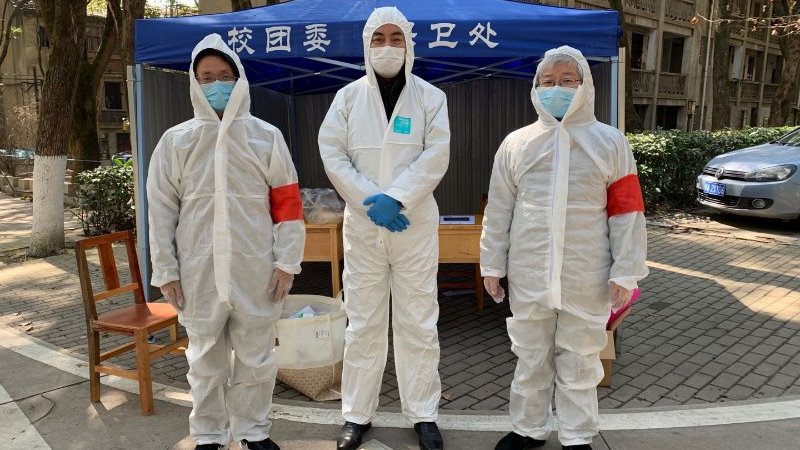 ——下午1点,袁新华、张日华、张文军、王曦四位老师脱下厚厚的防护服,准备交接换班。此时,他们已经在学校家属区第八网格工作了4个小时,落实小区封闭管理要求,为所负责区域内的居民提供送菜、送餐、送药到楼栋门口。此外,还有周华民、樊自田、蒋文海、廖敦明、刘鑫旺、金俊松、黄志高、朱彬、黄安国等老师参与到重点楼栋值守和网格服务工作,他们是风雨中的“逆行者”,以实际行动铸就红色防疫屏障。