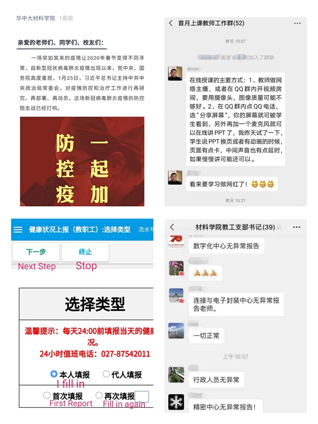 教师集思广益,克服困难,探索在线授课、网上指导教学方法:录制课程教学录像,实现资源共享;“网红直播”授课方式,老师学生线上交流学习;通过微信QQ交流群进行辅导答疑,实现混合式教学……