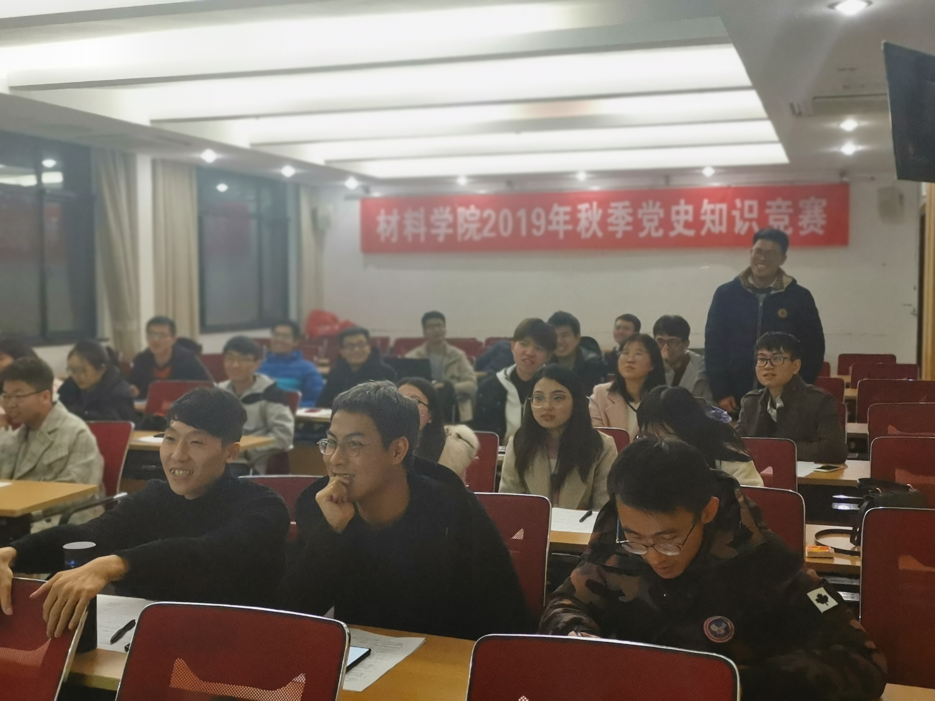 在先进制造大楼西楼A308开展了研究生2019年秋季党史知识竞赛活动,此次活动的开展旨在为研究生普及党史知识,增强研究生对中国共产党的了解。本次活动有八支队伍入围,每支队伍3人,其中有研究生党员,也有入党积极分子,大家热情高涨地投入到此次活动中。A漫