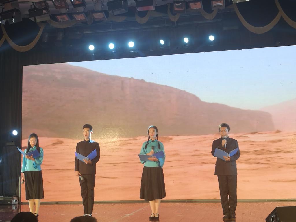 才子佳人团队在王曦老师的指导下,带来了配乐诗朗诵《河床》。伴着悠长的《黄河颂》的音乐声,舞台上四位同学慷慨激昂地朗诵着《河床》,一声声朗诵直击观众的心灵,台下爆发了一阵阵的掌声。该节目最终以95.625分的好成绩荣获亚军,并且获得了评委老师的高度评价。