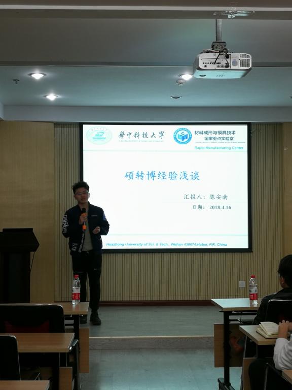 首先,2017年国家奖学金获得者陈安南博士和郭雁鹏博士分别发言。陈安南博士主要分享了他在2016年时对“是否转博”这个问题的思考以及转博后的科研经历和收获。陈安南博士的发言风趣幽默、真挚诚恳,给大家分享了很多宝贵的建议,并且其所取得的学术成果以及健康生活、快乐科研的人生态度给大家做出了很好的表率。