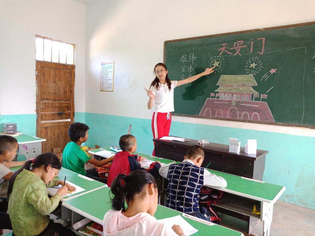 研究生党员陈琳给孩子们观看了天安门广场国庆节阅兵仪式视频,教孩子们画宏伟的天安门。研究生党员杜睿利用晨读时间向三四年级的小朋友讲解社会主义核心价值观以及党的十九大精神,增强孩子们饮水思源不忘党恩的意识。