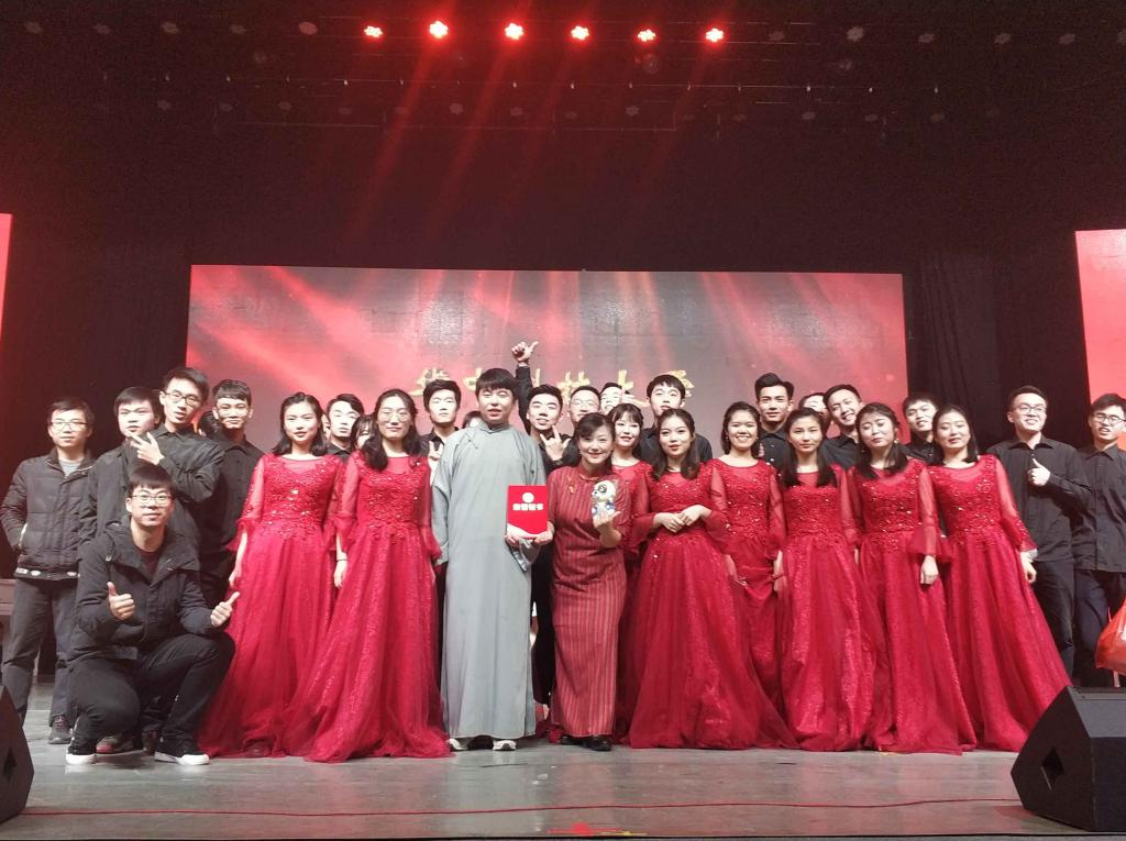 研究生工作组王曦老师担任本次节目的配乐诗朗诵部分和合唱指挥。在绚烂的灯光下,旋律在流淌,感情在激荡,队员们感情饱满地演绎着,现场观众给予了热烈掌声,最后节目以92.23分的好成绩荣获才艺十佳第六名。
