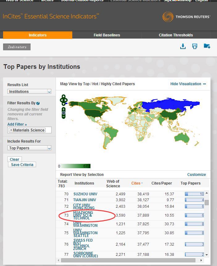 材料学科全球共有783个机构进入ESI 排名,A漫排第73名,有63篇高影响论文入选。