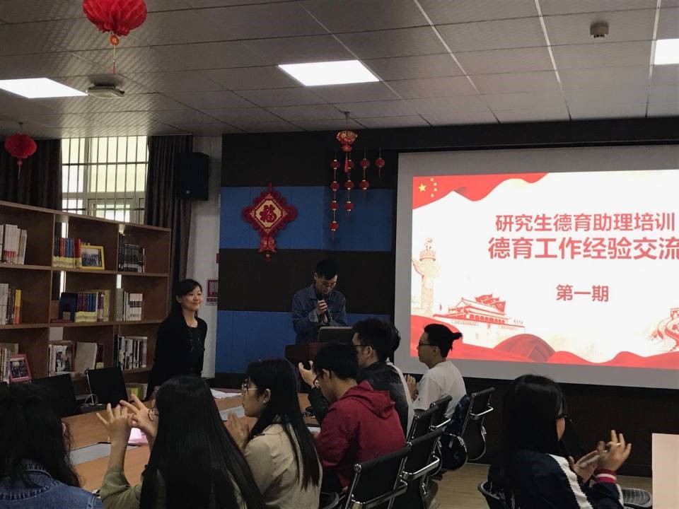 (通讯员:李方伟)4月26日,应学校研究生党务中心邀请,研究生辅导员王曦老师以嘉宾身份参加了校研究生党务中心举办的本学期第一期德育工作经验交流会暨研究生德育助理培训,与来自学校各院系35位研究生德育助理进行了研究生思政工作交流。