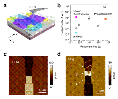 研究中,团队利用了原子力显微镜的探针来实现对器件区域内铁电极化图案的设计,空间分辨率接近200nm。基于铁电体极化可翻转特性,团队在单个器件上实现了不同构型的光电探测器,包括光电导器件、PN结型光电二极管以及NPN双极光电晶体管等,并通过光电流成像清晰的证明了不同器件的工作原理差异。所构建的NPN双极性光电晶体管器件表现出了最优的光电探测性能,响应度>10A/W的同时,可以保持<20μs的超快响应速度,是目前二维光电探测器中的最好水平。研究展示了铁电极化调控方式在优化构建光电子器件方面的特殊优势,而其特有的可重构、非易失特性等也赋予了单个器件多功能化,有助于进一步推动光电子器件工艺的微型化和集成化,有望进一步衍生出一种全新的器件结构以适用于不同的应用场景。
