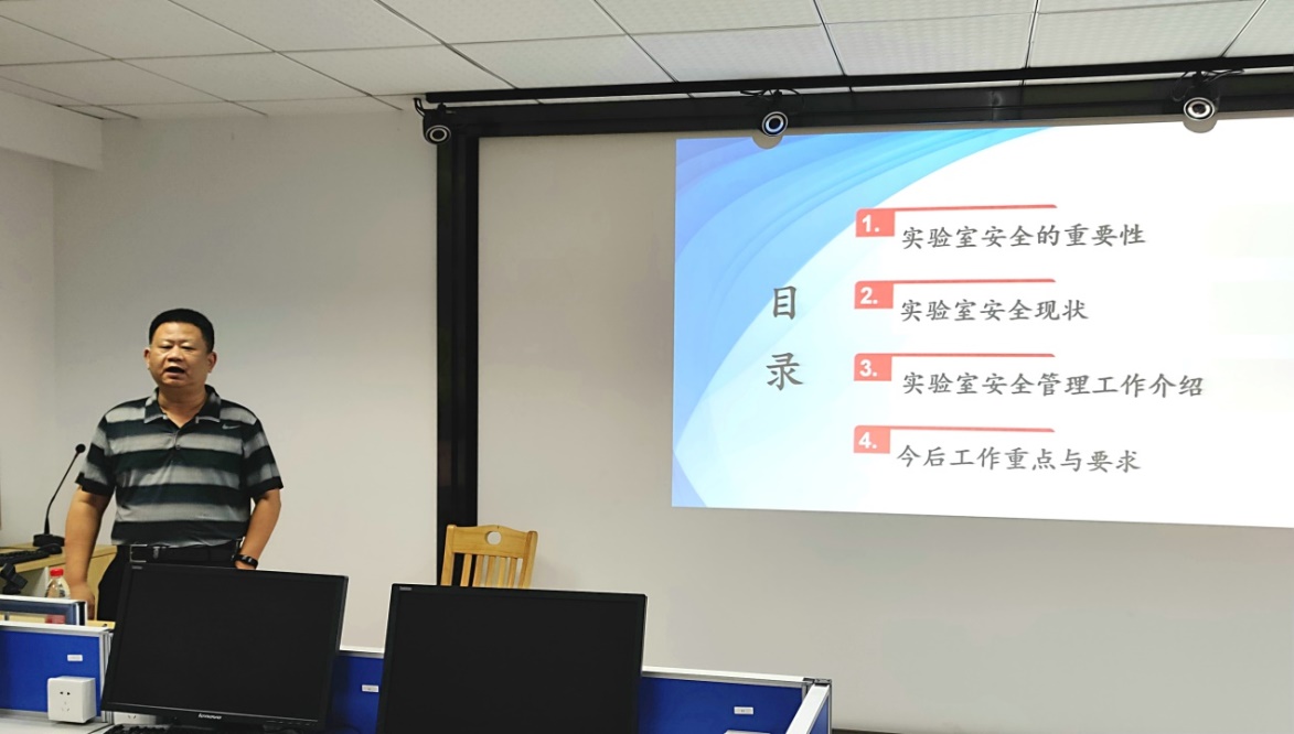 在实验室安全工作中存在的问题和一些具体案例,阐述目前我院实验室安全工作面临着巨大挑战。前一阶段我院实验室安全工作取得了一定成效但仍然存在很多问题,他表示要进一步加强实验室安全管理工作的制度化建设,落实各项举措,促进实验室的安全规范化、制度化,并对今后的工作重点进行了布置提出了明确的要求。